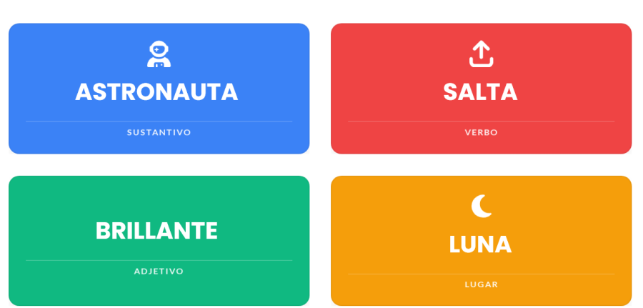 Un set de cartas de categorías gramaticales (sustantivos, adjetivos y verbos) visualmente diferenciadas.