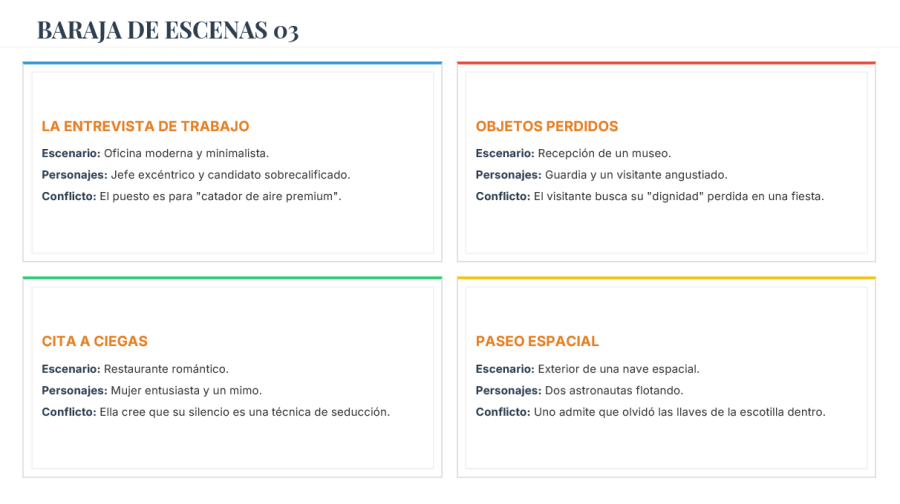 - Cómo usarlo: Un representante de cada grupo elige una carta al azar. Tienen 2 minutos para organizar una escena breve. También se pueden usar como consigna de escritura dramática: "Escriban el guion de una escena basada en esta situación".