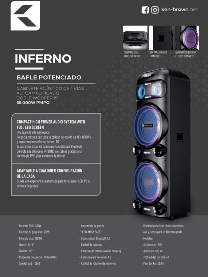 El Ken Brown INFERNO es un bafle autoamplificado de alto impacto, diseñado para quienes buscan potencia, calidad de sonido y presencia visual en un solo equipo. Equipado con doble woofer de 15”, brinda graves profundos, medios definidos y un rendimiento sonoro ideal para fiestas, eventos y reuniones de gran escala.