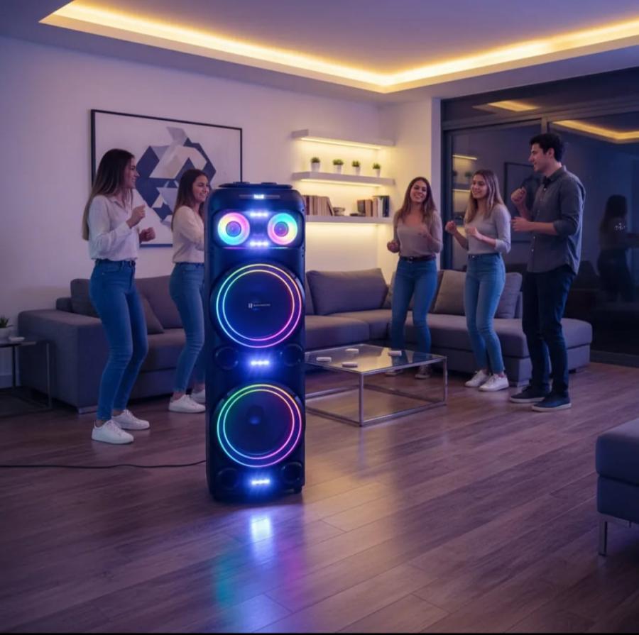 Su gabinete acústico de 4 vías garantiza una reproducción equilibrada, mientras que la iluminación LED RGB multicolor realza cada ambiente con un efecto visual moderno y dinámico. Incorpora conectividad Bluetooth, además de entrada auxiliar, permitiendo una conexión rápida.