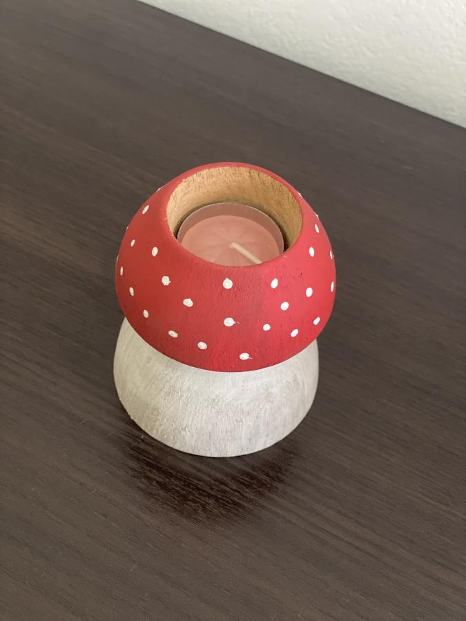 Porta vela de soja o vela de noche con forma de honguito. Madera de algarrobo pintado.