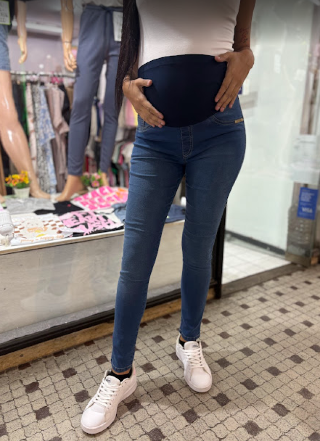 Jean maternal con cintura elastizada y banda de algodón que acompaña el crecimiento de la panza. Súper cómodo, flexible y adaptable a todas las etapas del embarazo.