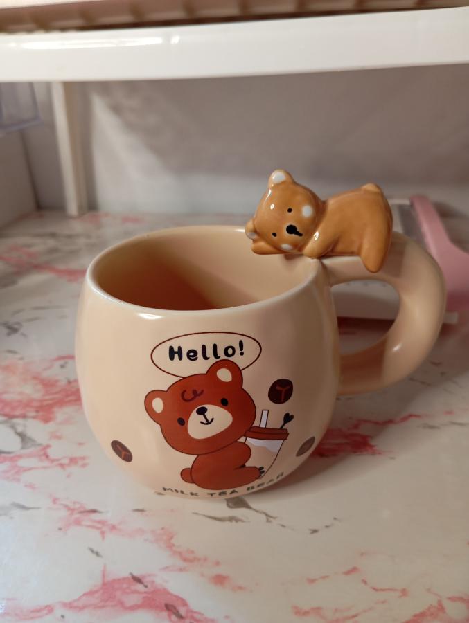Hecha en cerámica de alta calidad, tiene un diseño suave con un pequeño osito 3D recostado sobre el borde, y la frase “Hello!” que te saluda cada día 🐻☕