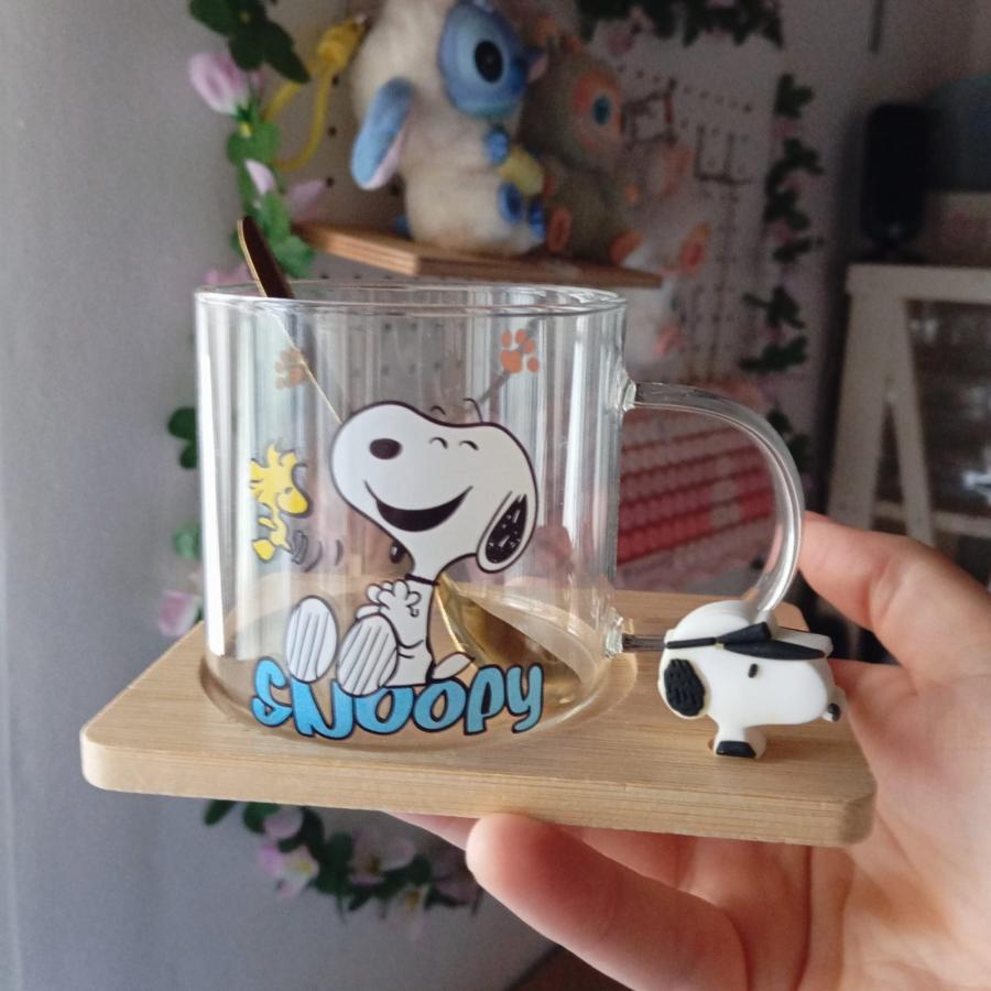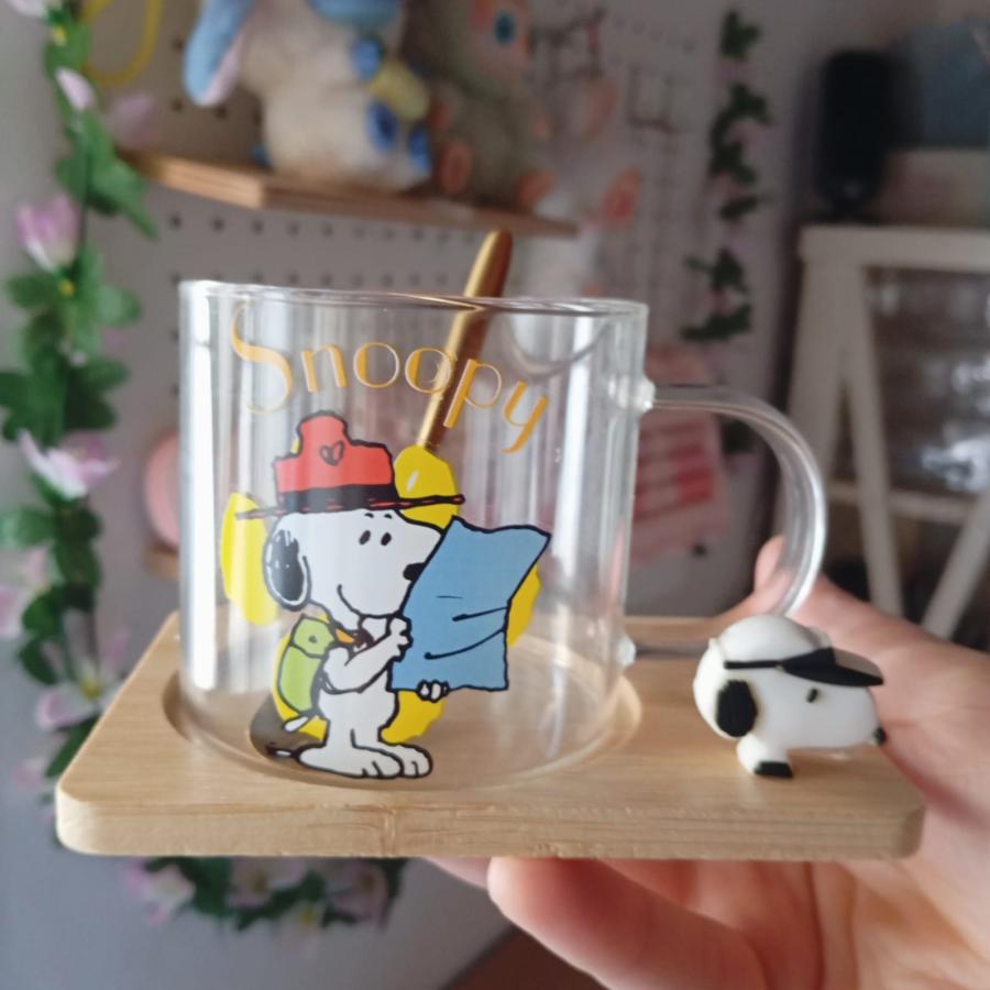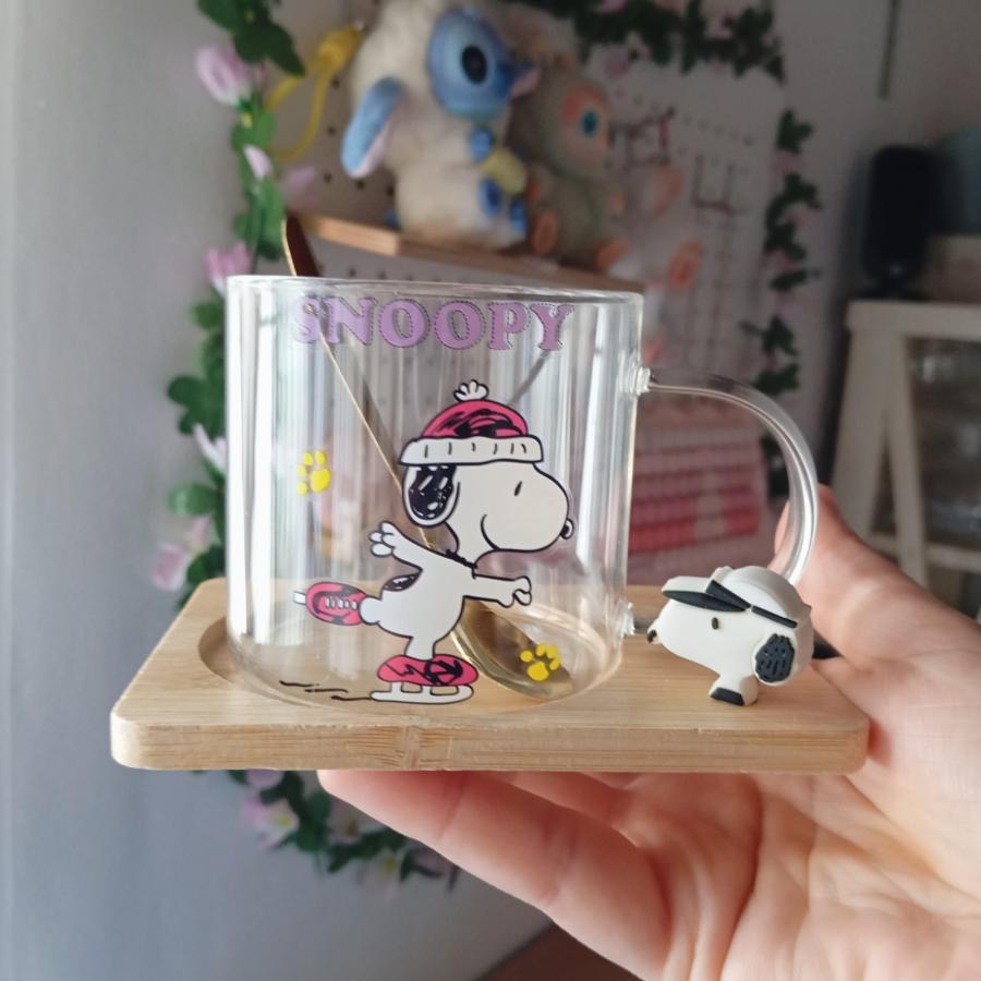 Tazas de vidrio con base de madera y cucharita dorada, disponibles en tres diseños: Snoopy feliz, patinando o explorador.