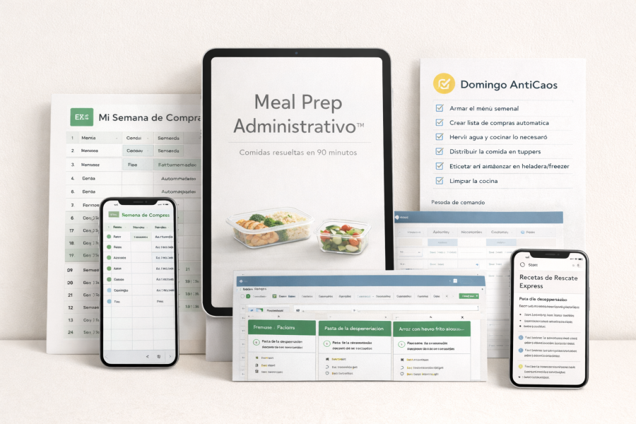 Este producto te da un sistema simple y realista para dejar listas tus comidas semanales en 90 minutos, usando ingredientes comunes y sin cocinar todos los días.