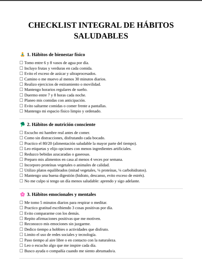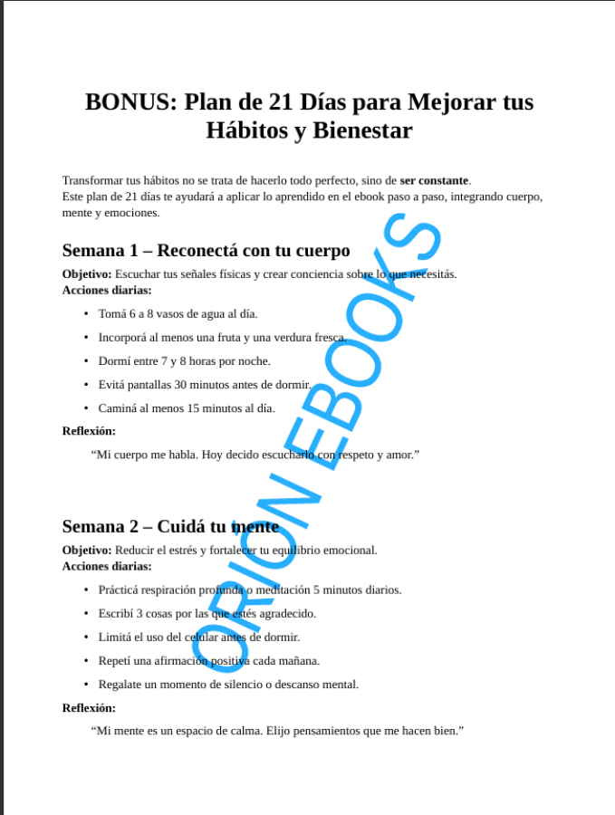 Además, este ebook incluye un plan de 21 días con pasos claros para poner en práctica lo aprendido y un checklist imprimible, ideal para registrar tus avances y mantener la motivación diaria.