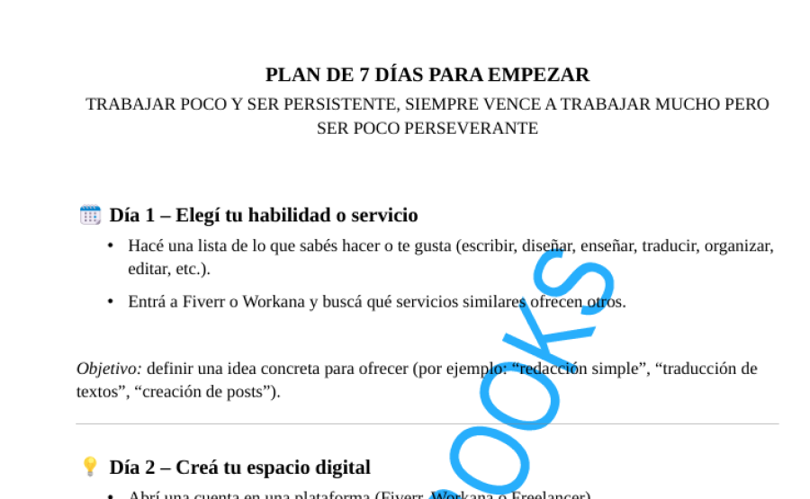 El libro incluye además un plan de acción de 7 días, pensado para que pongas en práctica lo aprendido desde el primer momento. Cada día se enfoca en un paso concreto: identificar tus habilidades, definir tu nicho, crear tu primera fuente de ingreso, y establecer un plan sostenible.