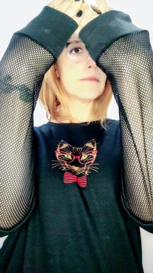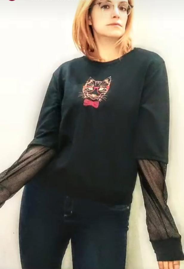 Buzo de frisa de algodón, único en stock. Está bordado a máquina y tiene mangas de red. Queda solo uno en talle L.