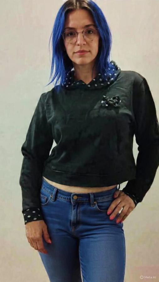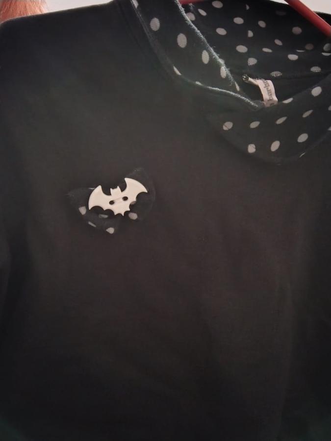 Buzo de frisa, talle S, combinado con lunares y moño con 3D