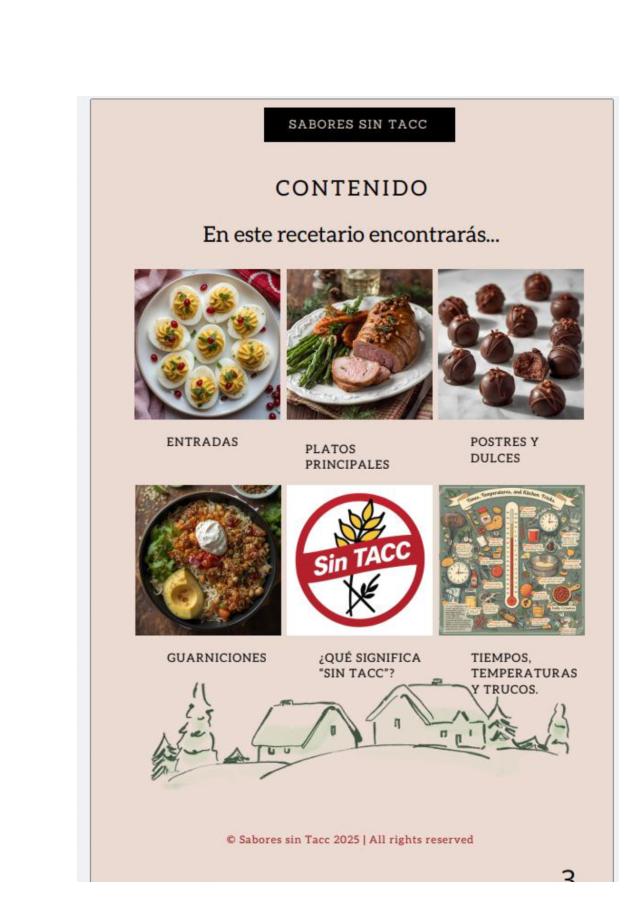 Sabores sin Tacc es mucho mas que un recetario: es una invitacion a disfrutar de la cocina sin gluten con creatividad, sabor y alegria. Cada receta ha sido cuidadosamente elaborada para que quienen deben o eligen llevar una alimentacion sin Tacc puedan disfrutar de platos deliciosos, variados y faciles de preparar. Con ingredientes accesibles y consejos practicos, este libro demuestra que comer sin fluten no significa renunciar al placer de una buena comida.