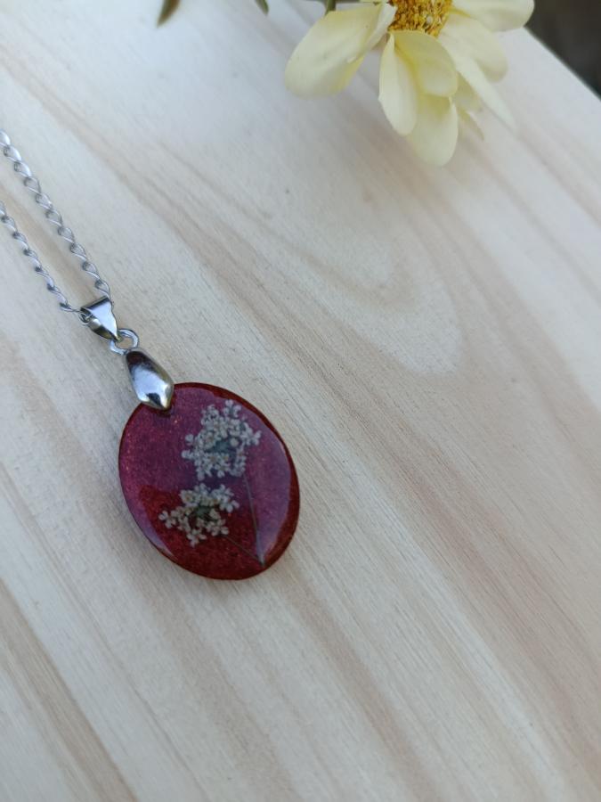 Impactante, audaz y profundamente femenino. Nuestra línea "Fuego Botánico" utiliza flores naturales de Encaje de Reina Ana preservadas sobre un fondo rojo escarlata con alta concentración de micro-glitter.